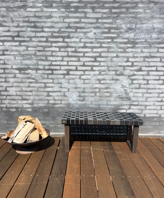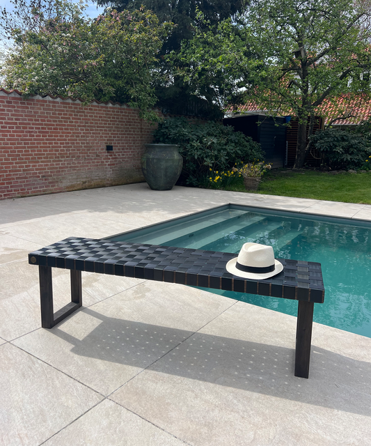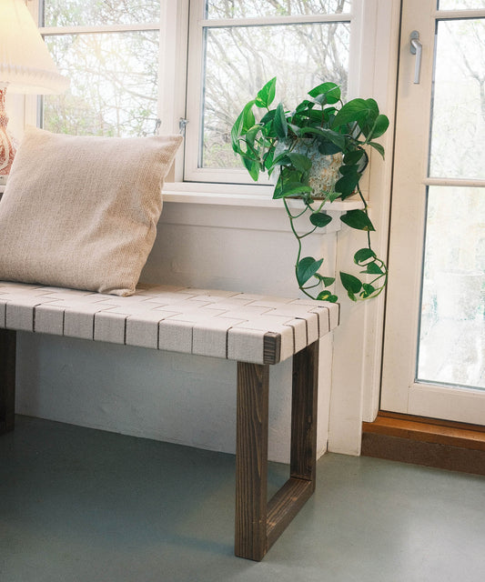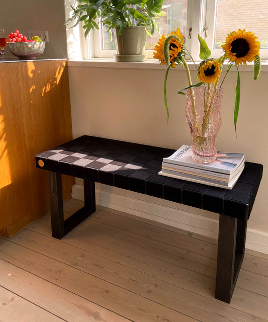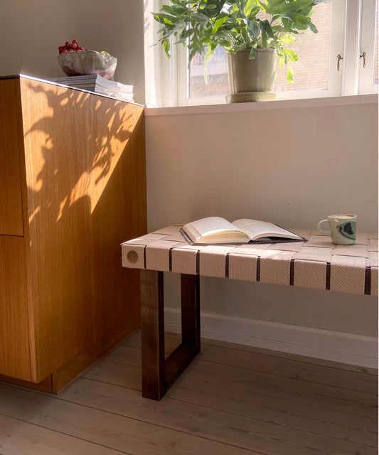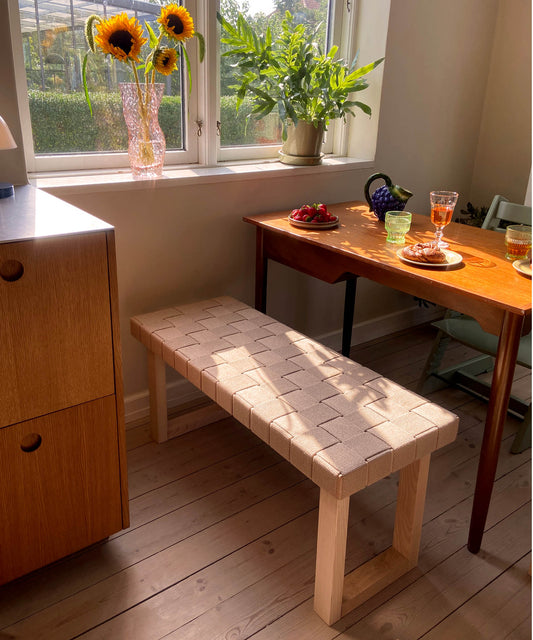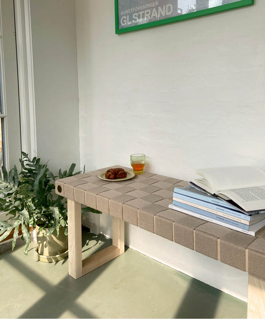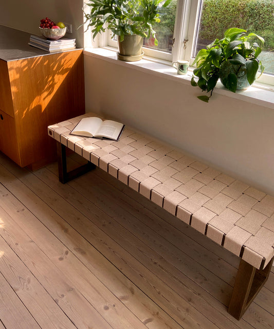 Alle bænke er produceret i Danmark og fremstillet i 100% frasorteret træ fra de danske skove. Du finder bænke flettet med gjorde af genanvendt bomuld og gamle sikkerhedsseler. Bomuldsgjorden er vævet i Italien og lavet af kasseret bomuldstøj. Sikkerhedsselerne stammer fra skrotbiler.