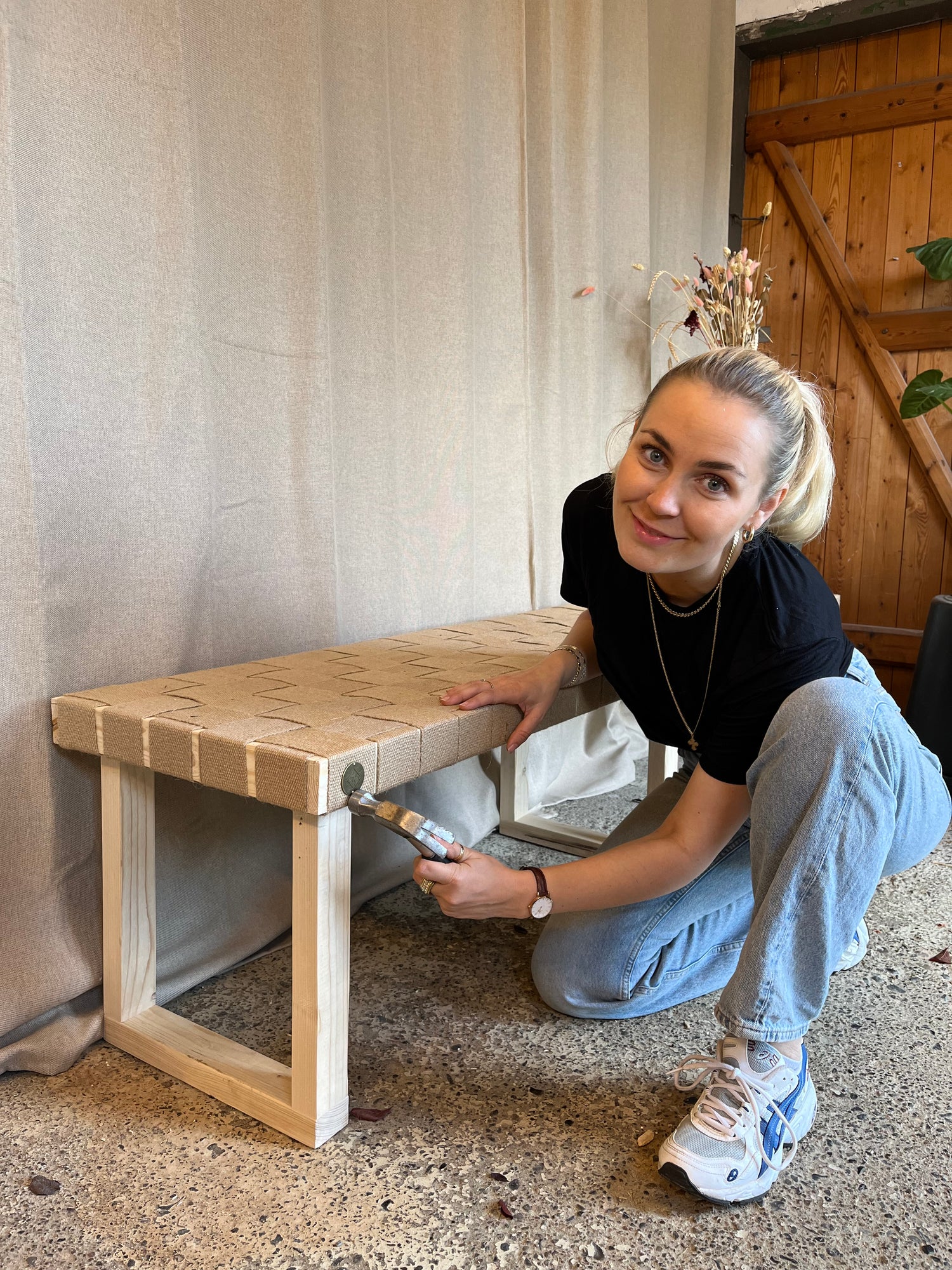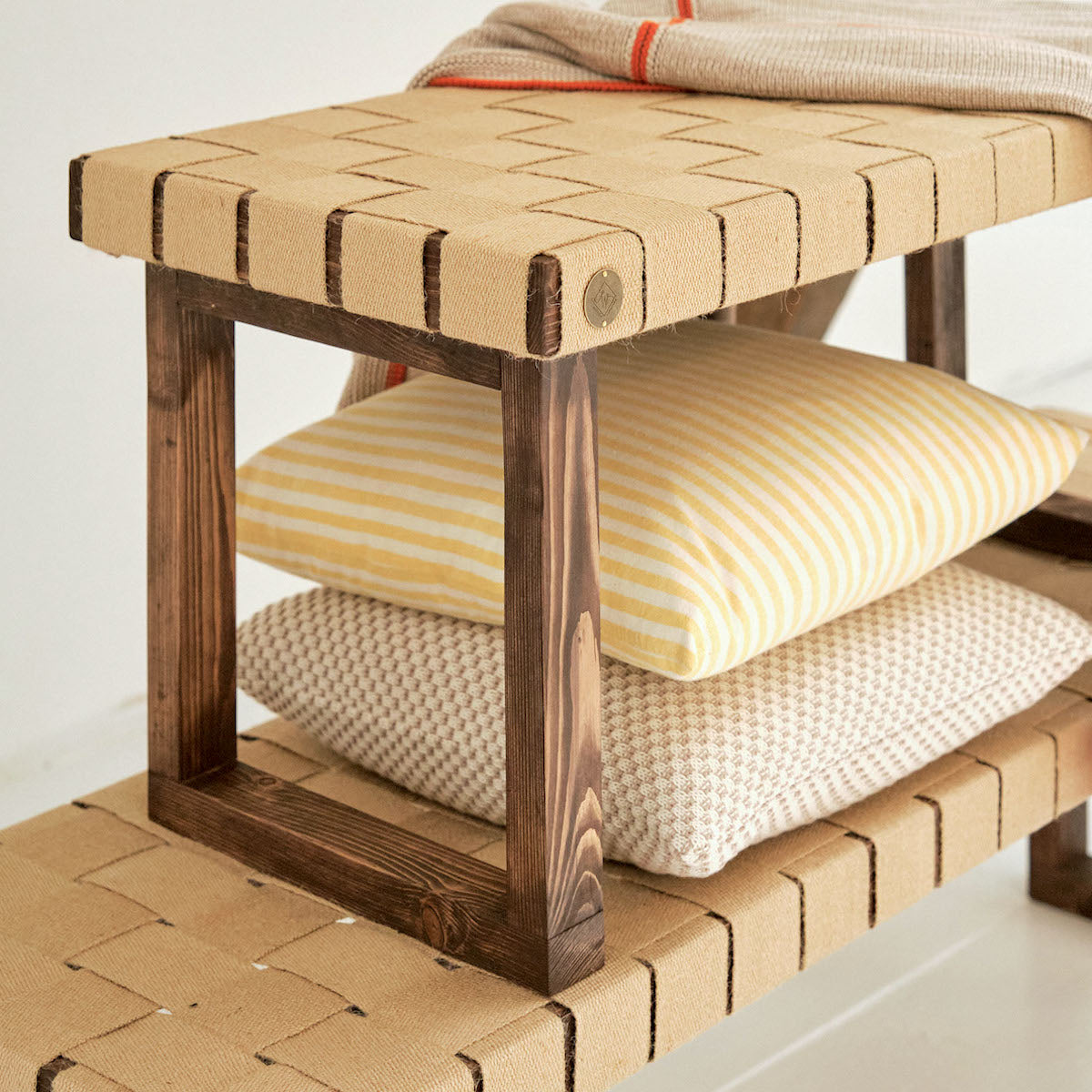 Bench made from residual wood, woven with Öko-Tex certified linen straps.