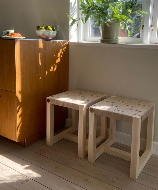 Ella skammel er fremstillet af 100% frasorteret træ fra danske skove, samt et håndflettet sæde af genanvendt bomuld. Alle skamler fra Wecycle Furniture er produceret i Danmark.