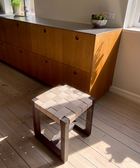 Det smukke sæde er håndflettet med gjorde, som er vævet af kasseret bomuldstøj. Bomuld, der ellers ville have endt på forbrændingen, har således fået nyt liv igennem vores bænke og skamler, som kan holde i mange år frem.