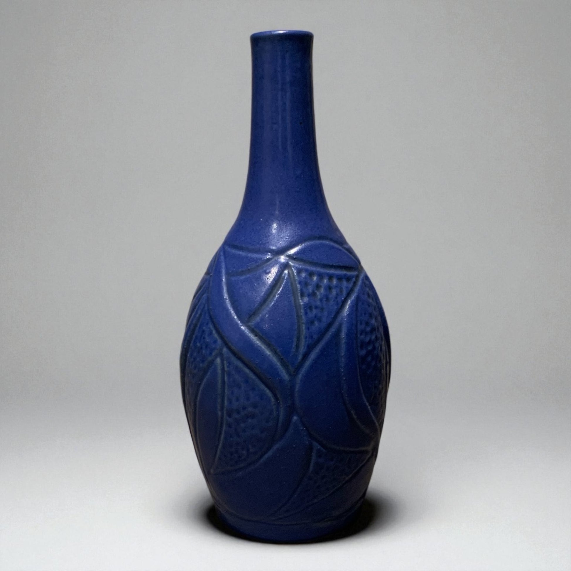 Vintage vase fra L. Hjorth Bornholm – 21 cm høj i dyb blå glasur. Klassisk dansk keramik med smukt håndlavet mønster, perfekt til både blomster og som dekorativt kunstobjekt.