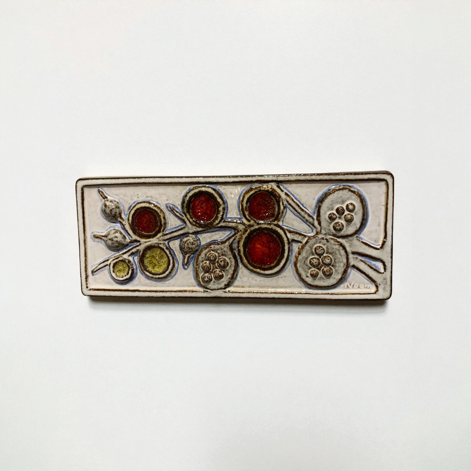 Det håndlavede relief viser et botanisk motiv i smukke røde, grønne og blå glasurer – et karakteristisk udtryk for Noomis legende og kunstneriske stil.