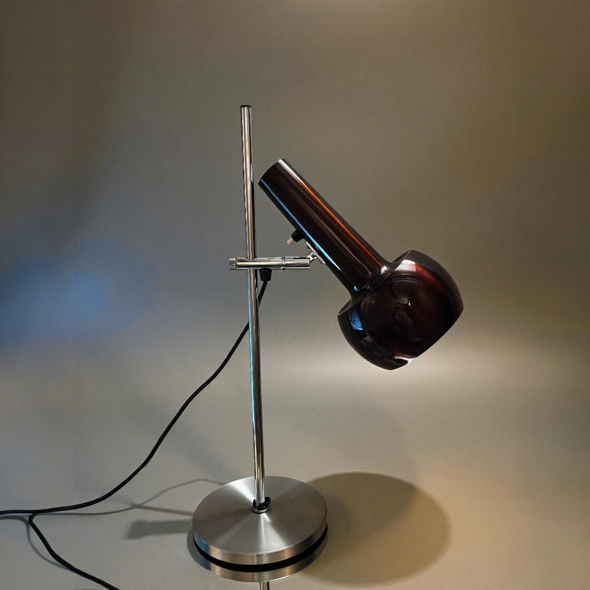 Elegant vintage bordlampe fra 1970’erne i brunlakeret metal med stel i børstet krom. Lampens højde kan justeres, og skærmen kan vippes, så lyset nemt rettes efter behov – perfekt som skrivebordslampe eller stemningsfuldt hjørne-lys.