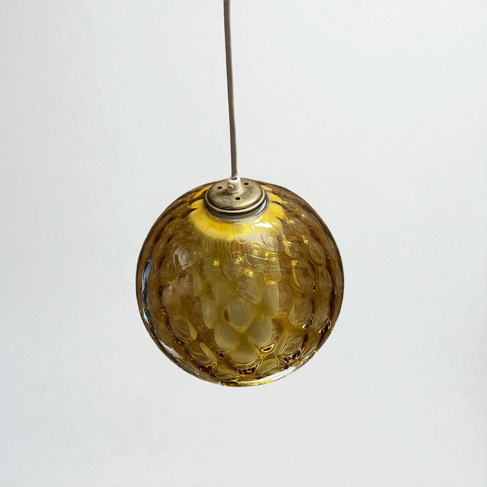 Vintage glaspendel i ravfarvet glas med jordbærglas – Ø17 cm. Den gyldne farve giver et varmt og hyggeligt lys, perfekt til både moderne og retroindretning. En klassisk dansk vintage lampe, håndplukket af Wecycle Vintage, der kombinerer æstetik, kvalitet og karakter.