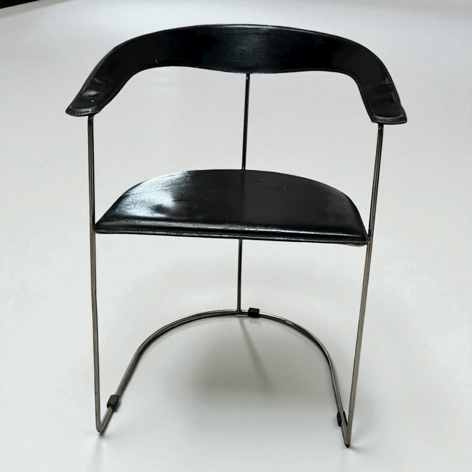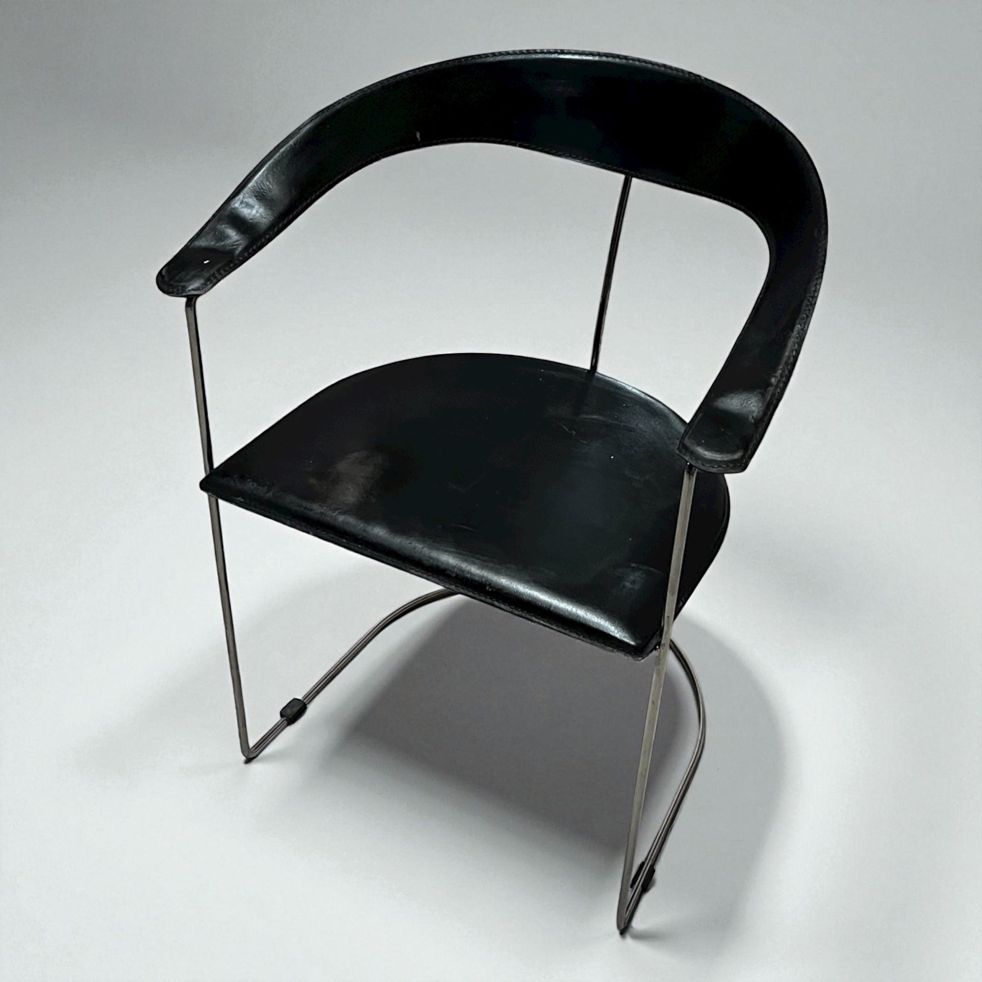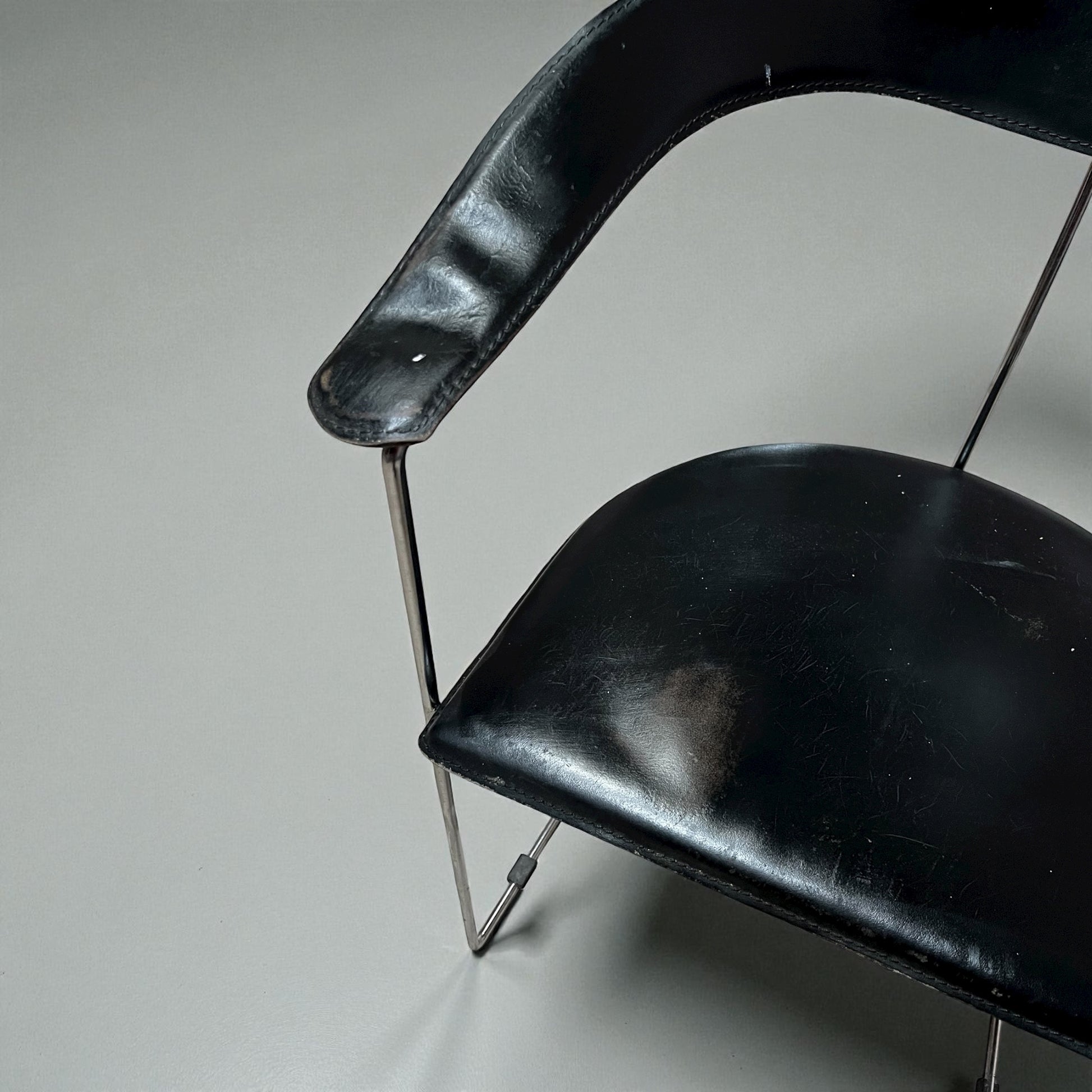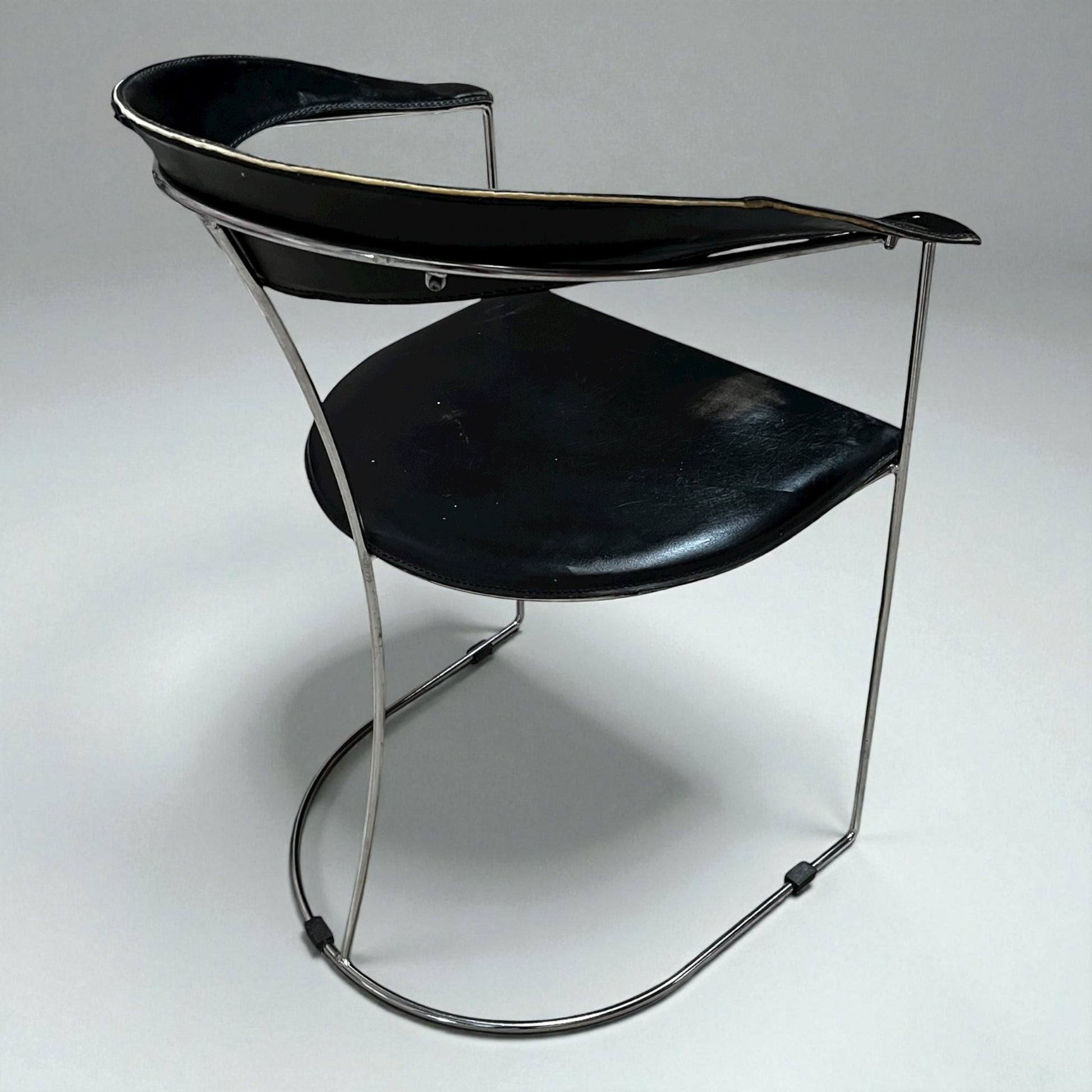Vintage stol i T-Chair stil med sort læder og kromstel. Elegant mid-century inspireret design med smuk patina og karakter – håndplukket af Wecycle Vintage.